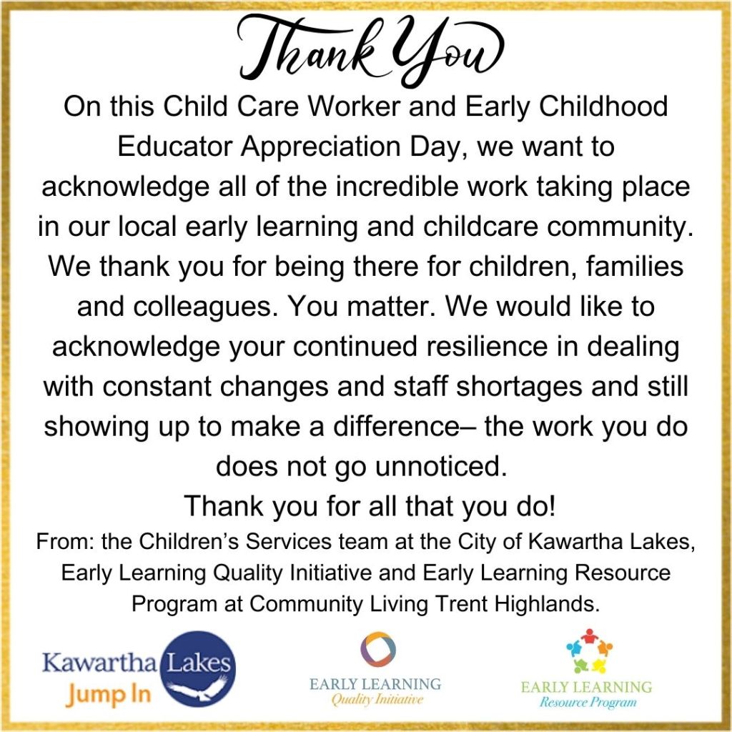 Our local communities in the City of Kawartha Lakes and County of Haliburton are fortunate to have so many incredible educators and staff in their centres and programs. We know the list of what you do each and every day can become quite long when we start looking at all that you do; while it may seem it goes unnoticed, please know even when it isn’t acknowledged on a regular basis, it is very much appreciated!