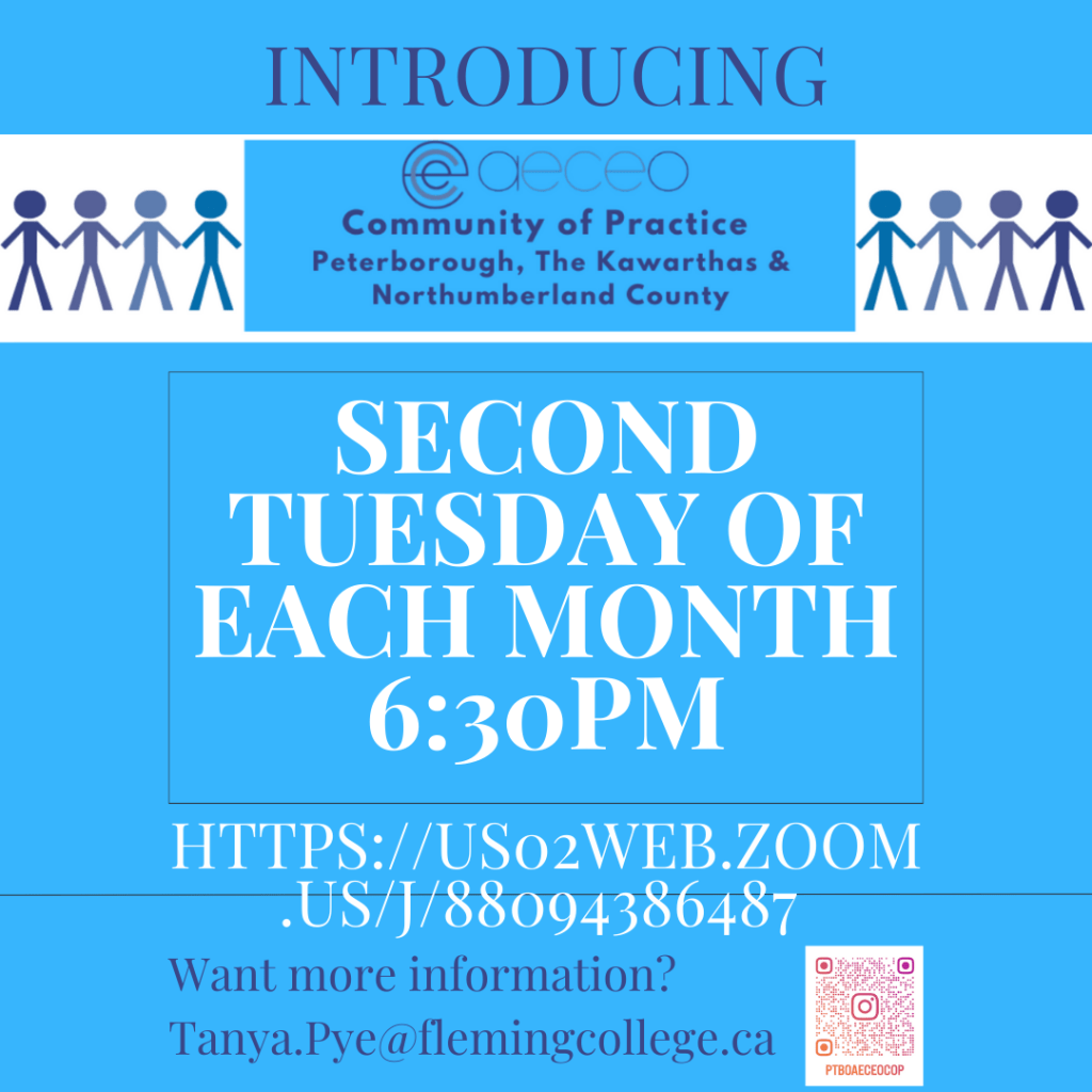 Did you know you are welcome to attend the upcoming AECEO Regional Community of Practice? Educators from our local early learning and childcare community are invited to join the Peterborough region for the upcoming Community of Practice taking place on Tuesday, November 14th at 6:30 pm. You can join the virtual gathering here.