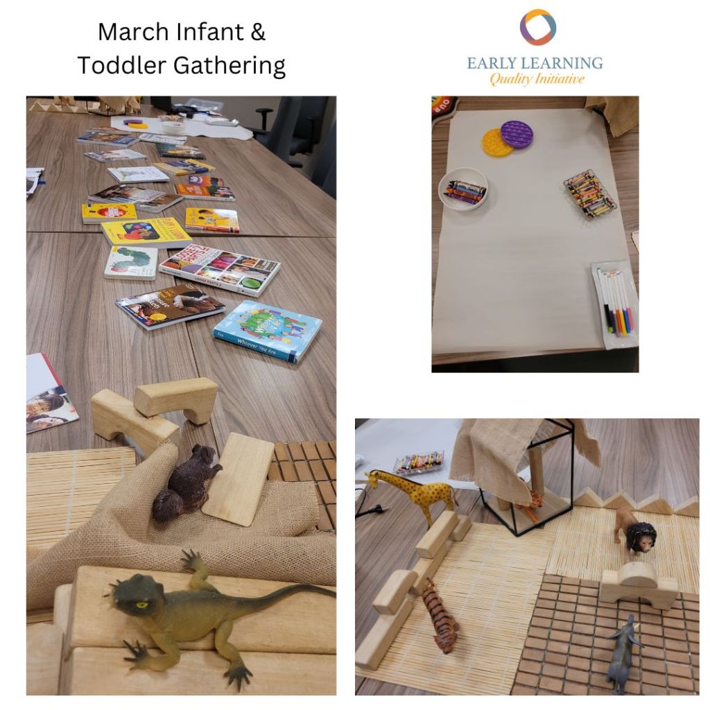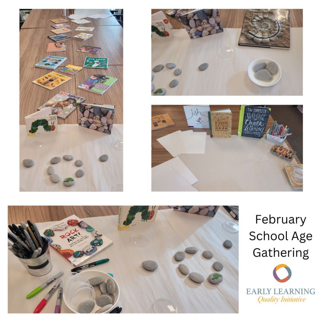 Through these gatherings, we continue to have wonderful conversations together while also exploring a variety of materials and resources. Each month, our invitations of materials and things to reflect on and discuss, come from the conversations and questions brought forward in previous months. There are common threads that come up in discussion at each of the gatherings: How Does Learning Happen, our image of the child, loose parts, risky play, program planning, documentation, values, mentoring and coaching others – and so much more!