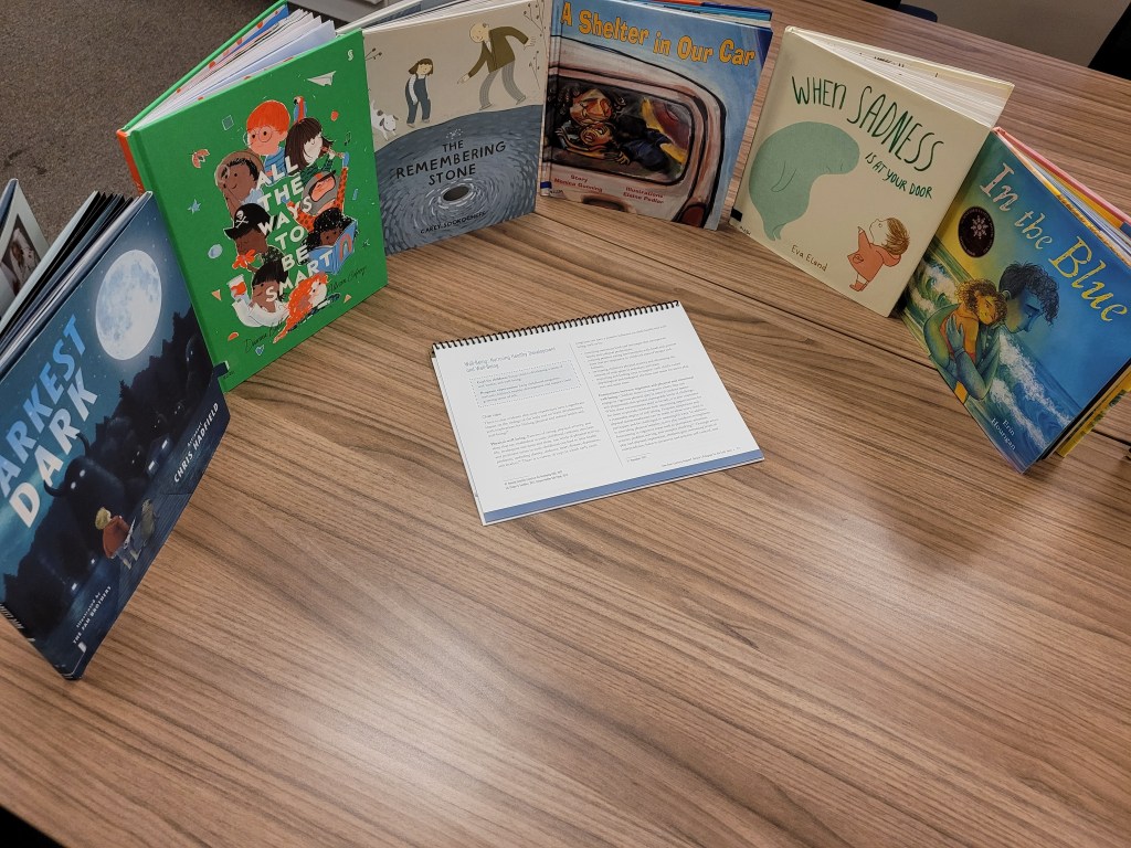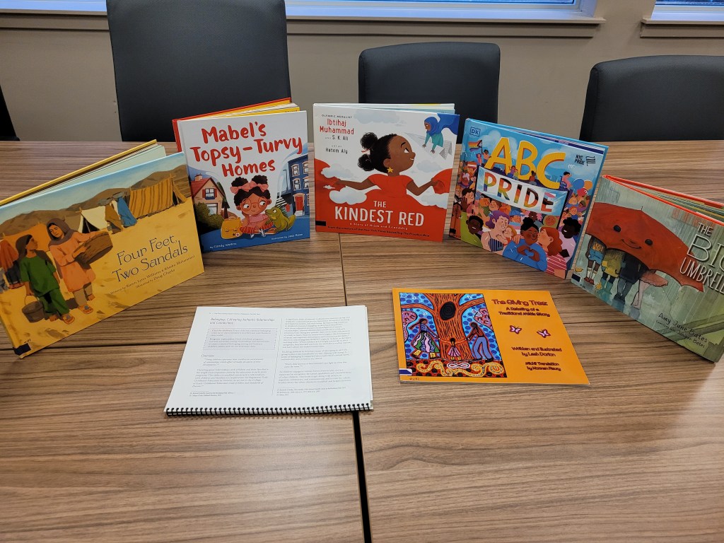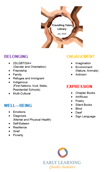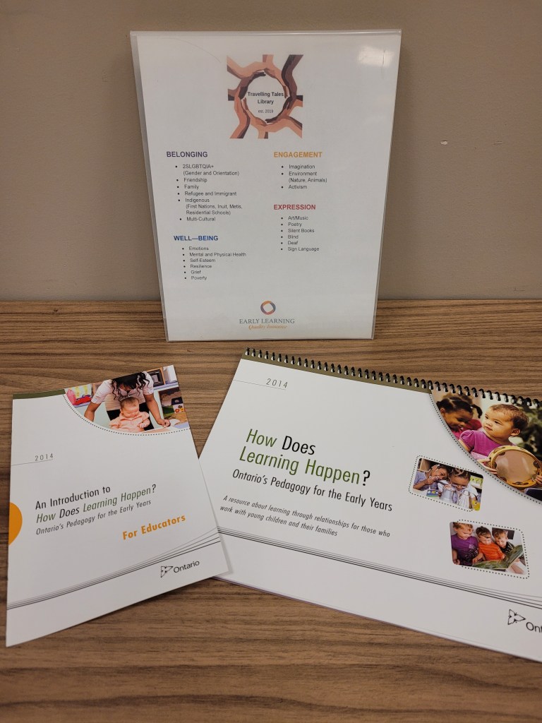 Tonight’s invitation of materials includes sharing 1 book from each of the different categories of materials in our Travelling Tales Library. All of the different categories are sorted through the 4 foundations in How Does Learning Happen?. While we understand many of the books could fit into more than one category and/or foundation, we had to choose one for the library program we use.