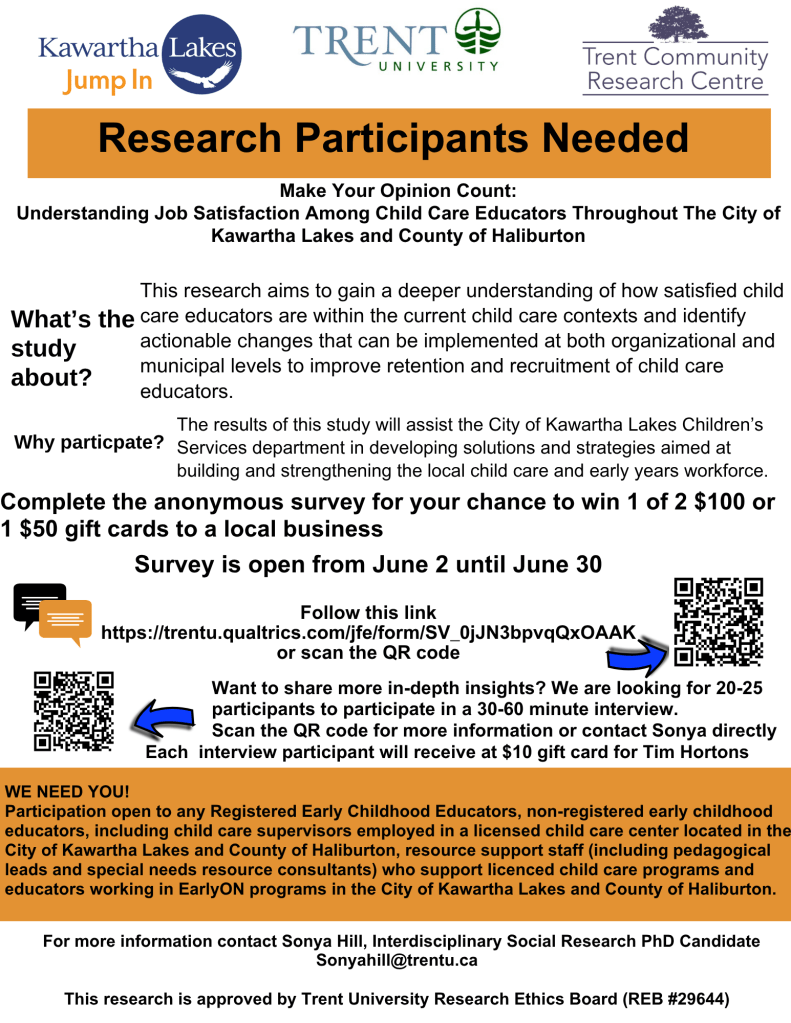The City of Kawartha Lakes Children’s Service department in partnership with Trent University Interdisciplinary Social Research PhD candidate Sonya Hill, are conducting a research study on job satisfaction of child care educators in the City of Kawartha Lakes and County of Haliburton.